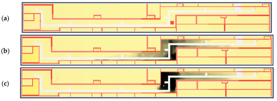After 60 s from the outbreak of fire, the smoke covers zone VI and partly V. It then spreads for about 180 s and persists in zones IV, V, and VI. Up to 400 s after the occurrence of a fire, the employees of the metro have the possibility to safely leave the technical rooms of the metro (Figure 14 and Figure 15).