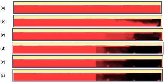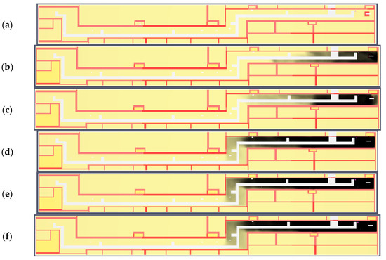 Variant D. Smoke propagation at a height of 1.8 m in subsequent time steps: (a) 0 s; (b) 60 s; (c) 120 s; (d) 180 s; (e) 300 s; (f) 390 s; Ref. (a) Red square indicates the source of the fire.