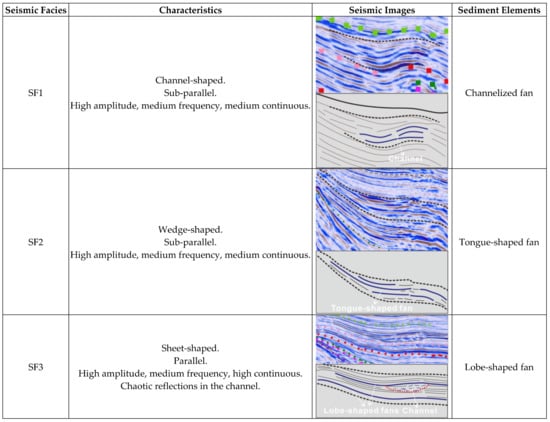 Combined with seismic interpretation and attribute analysis, the characteristics of seismic facies of different sublacustrine fans were analyzed. In this study, three seismic facies were identified in deposits of HDTC, as described below.
