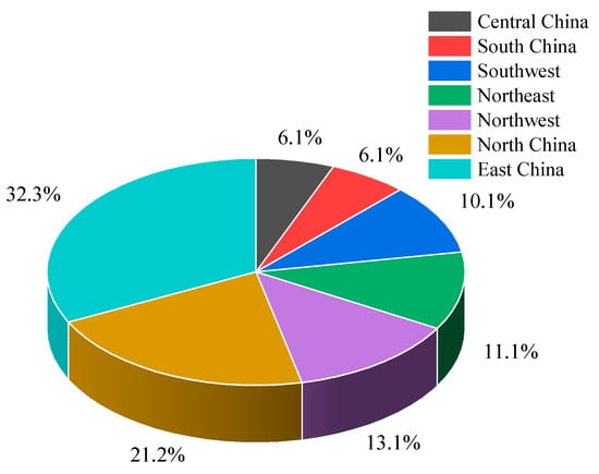 Coal-energy cities are cities that range from individual coal mines to cities that integrate production, living, services, and trade. Coal mining is the pillar industry of coal cities, and coal production and output are their main economic function. In addition to providing energy and power for the city’s heating, smelting, and transportation industries, coal also fuels the city’s industrial and domestic electricity through thermal power generation []. The regional distribution of coal energy output value is shown in Figure 1. Many coal-resource-based cities struggle with achieving coordinated development between the economy and the environment because most energy-resource-based cities are heavily dependent on the mining and processing of mineral resources, and the coal energy industry typically has characteristics of high energy consumption and high emissions. This is especially true given China’s ongoing efforts to promote energy conservation and emission reduction. Excessive resource consumption and environmental harm will steadily decline when the industrial structure is upgraded and changed. As a result, the industrial structure must change for resource-based cities’ economies to grow sustainably.