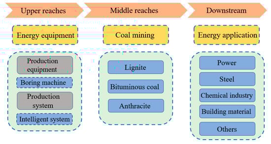 The coal-energy city’s industry as a whole shows a structural feature that the second, third, and first industries are heavily dependent on the coal energy industry. The industrial structure of coal energy is shown in Figure 3. Coal-based energy cities thrive on coal. Most of them are gradually developed from coal energy production bases. The secondary industry dominated by coal energy accounts for an absolute proportion of the urban economic and industrial structure. The output value and employment of the coal energy industry are in a monopoly position in various industries. The output of coal energy and the market price of coal energy largely determine the rise and fall of cities []. In terms of the construction of the industrial chain, with the coal energy industry as the center, vertically, it is associated with gunpowder, machinery, manufacturing, transportation, and civil engineering industries, and then derives a series of manufacturing industries such as the electricity, metallurgy, and chemical industries, which are raw materials. Horizontally, there are services such as technology, sales, logistics, and transportation. The coal energy is dominated by the export sales of primary products, which is weakly related to the non-energy industries within the city, resulting in a certain degree of labor market segmentation and commodity market segmentation which hinders the city’s industrial economy from generating a positive externality and scale effect and developing in the direction of diversification and integration.