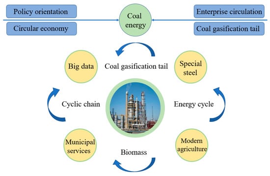 - The choice of industrial transformation mode for coal energy-resource-based cities. There are several choices for the mode of industrial economic transformation of coal energy-resource-based cities. If the coal energy-resource-based cities are still quite rich in resource reserves and have a good degree of mining, they can adopt the advantage extension mode to develop and establish an industrial cluster for deep processing and comprehensive utilization of coal energy. If the coal energy is nearly exhausted and the recoverable resources are insufficient, the alternative industry model can be selected to promote urban economic development []. While rationally developing the existing advantageous industries, seek new industries to complement each other and promote urban development. The green economy transformation model of coal energy-based cities is shown in Figure 6.