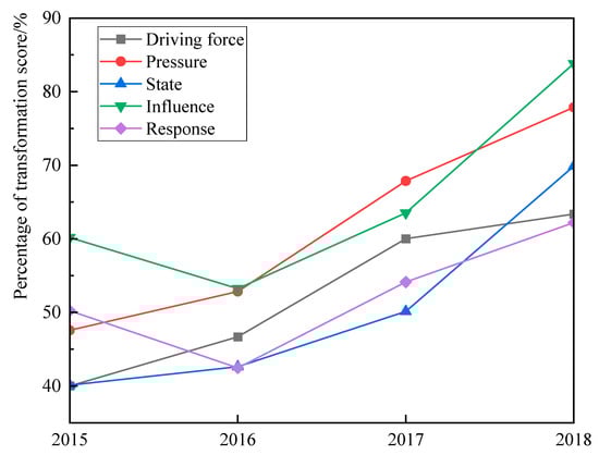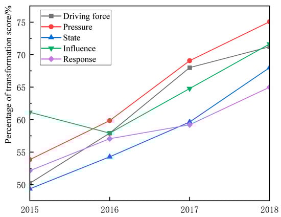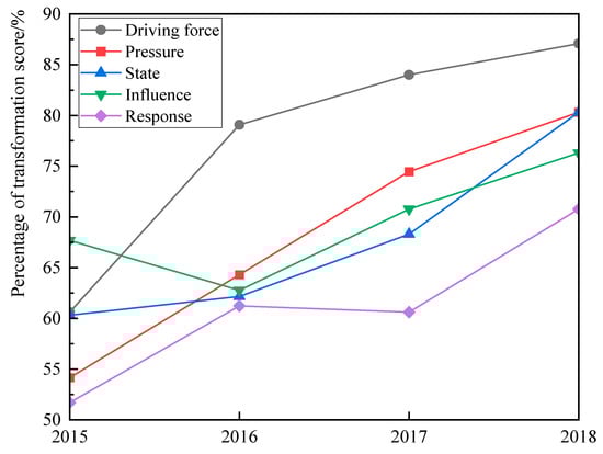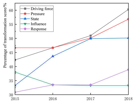 Economic transformation: according to the calculation results of the economic transformation evaluation model of coal energy-based cities, in the economic structure level, the transformation scores of each subsystem of a city showed an overall upward trend from 2015 to 2018, the transformation scores of driving forces increased from 0.606 to 0.871, and the transformation scores of pressures increased from 0.542 to 0.803 (as shown in Figure 7). This shows that in the practice of transformation, the driving force and pressure factors are in a good position, and the driving force for the economic development of coal-energy cities is sufficient. Rising driver scores indicate increased investment, contributing to the gradual economic and environmental transformation of coal cities.
