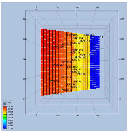 To illustrate the algorithm capacity to find multiple solutions to the history matching problem, the SPE9 reservoir model [34,35] will be used. The reservoir model developed by Killough [36] is a three-dimensional 9000 cells model with 24 cells in the X direction, 25 cells in the Y direction, and 15 cells in the Z direction. The reservoir model contains 25 producer wells and one injector well as shown in Figure 2 and Figure 3.