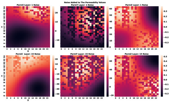 After that, for each cell, the permeability values , , and are scrambled with a geo-spatially correlated random noise to generate a starting point for the algorithm. The starting point is generated by adding the random noise vector that contains both positive and negative entries to the truth-model permeability values. The goal of using a geo-spatial random noise is to ensure that the starting model presents a realistic model where the permeability values are mostly geo-correlated. Figure 4 shows the noise added to the permeability values. Since it is difficult to plot all values, the figure only shows a sample of the added noise on the first and last layer of the reservoir model. However, it is important to note that all permeability values across all layers have been scrambled with noise in order to generate the starting point for the algorithm.