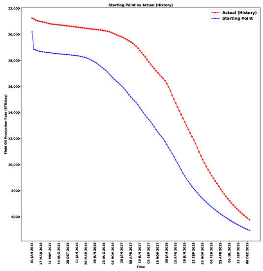 The difference between the actual historical FOPR (Field Oil Production Rate) values and the FOPR values generated from running the simulation on the starting point of the model. The objective function is calculated using Equation (1).