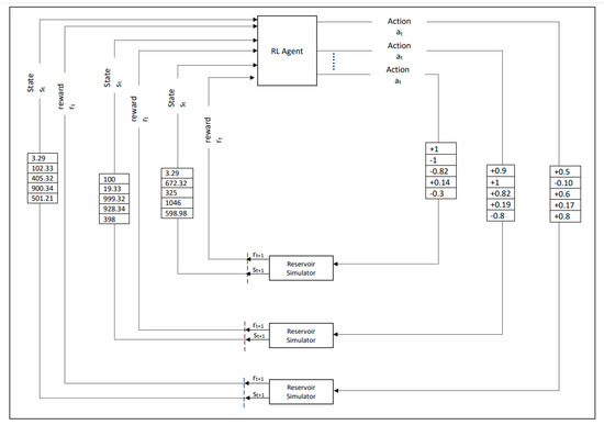 The way in which the actor–critic reinforcement learning trains and optimizes its agent gives us the chance to speed up the history matching process by training the agent in parallel and allowing it to collect experiences from running multiple scenarios of the history matching process at once. This can be done by allowing the agent to simultaneously interact with N number of environments, observe different N states, take N number of different actions, and collect N different rewards as shown in Figure 12. For example, in the case of SPE9, the batch size is set to 192 where the algorithm will run 192 experiments by interacting with the environment, then collects these experiments in a batch, then sends it to the agent to train its deep neural networks, and update their weights. Instead of waiting for a single environment to collect 192 experiments, the algorithm will launch eight environments in parallel where each environment collects 24 experiments which allows the agent to collect the 192 experiments in a much shorter time period.