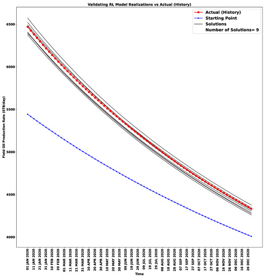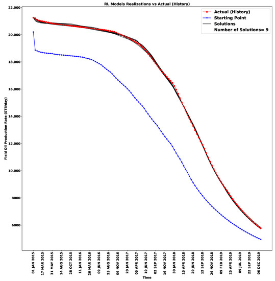 Per the definition of the reward function in Equation (4), as the agent tries to increase its rewards, it will tune the uncertain parameters and find models that reduce the objective function. As the agent spends more time in the environment trying to maximize its reward, it will reduce the objective function to meet the tolerance criteria, and thus, it will find a solution to the history matching problem. As shown in Figure 14, thanks to the stochastic policy the agent uses, it can find multiple different solutions as it tries to take different trajectories to better explore the environment.