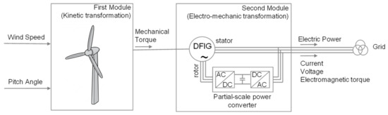 The paper considers the drivetrain of a wind turbine with DFIG technology as a reference use case in which the proposed DT development methodology is illustrated and applied. Figure 2 shows how the physics-based model is divided in two modules that could be used either coupled together or separately, depending on the available operational data. The first module represents the conversion from kinetic energy from the wind to mechanical power, taking the real values of the wind speed measured at the turbine and the pitch angle of the blades as inputs. The second module represents the electro-mechanical conversion. It takes the mechanical torque in the shaft of the DFIG as the input and the generated electric power and its related signals, such as phase currents and voltages or electromagnetic torque, are the outputs. Moreover, this second module includes a power converter and control system that enables the optimal operation of the drivetrain.