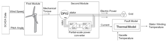 In this case, the overheating of the DFIG stator winding is studied. For this scenario, a thermal model is added to the normality hybrid model (Figure 4).