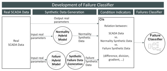 In addition, the normality hybrid model is used as a baseline to create new CIs that may improve the accuracy of the classifier. These CIs are calculated by comparing real operation SCADA data with respect to synthetic failure data and/or normality data generated by the normality hybrid model.