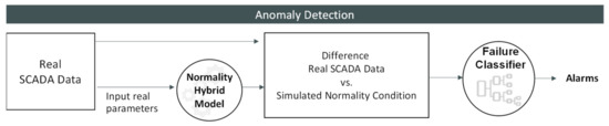 Finally, Figure 8 shows the execution phase, where CIs are created by comparing real SCADA data with the data simulated by the normality hybrid model. When the values of these CIs meet certain criteria detected by the classifier, an early alarm is generated.