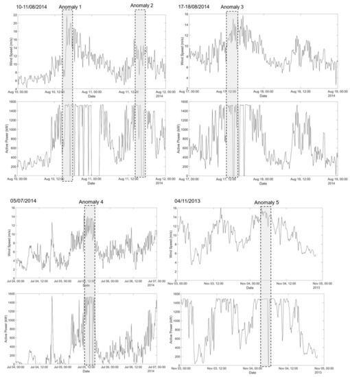 Five labelled anomaly cases of overcurrent during real operation (wind speed and active power signals).