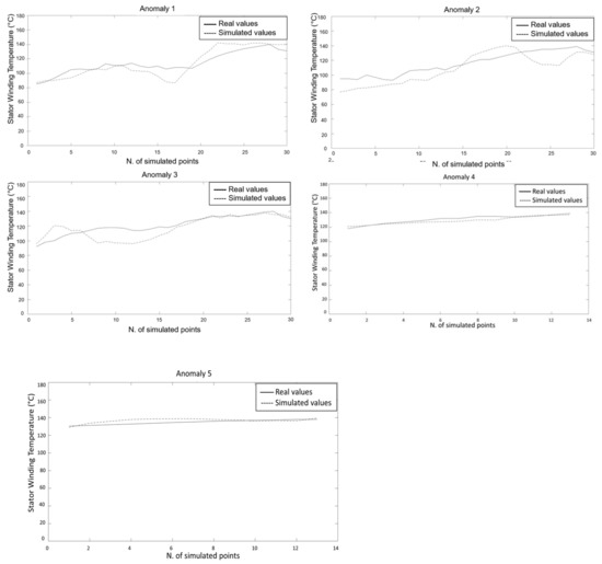 The failure modelling was validated using data during these five anomaly cases, obtaining results for the estimated stator winding temperatures, as shown in Figure 13, compared with the real SCADA winding temperature.