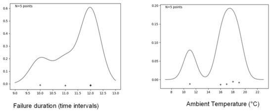 The failure duration and ambient temperature are assumed to be uniform during the whole duration of the failure. The distribution of these values in the training data is approximated with a kernel density function (KDE) with a Gaussian kernel (Figure 14). Continuous line represents the probability density functions of the duration and ambient temperature observed in the failure/anomaly instances from the real SCADA, while cross symbols represent real observations This technique, compared with density estimation by histogram, creates a smooth PDF that does not depend on the choice of binning. Instead, a Gaussian component is fitted to each data point. The Gaussian kernel is defined by the function: