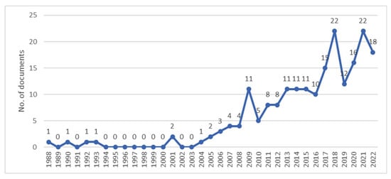 We analyzed the developments in publication output in the current literature on renewable energy use in farms. The annual scientific production of scholarly research is shown in Figure 2, where we enumerate the number of publications in the 34 most recent years of research in this field. Only a few documents on the above-mentioned topic were written each year from 1988 to 2008; even though the trend was improving and increasing from 2008, total publications never exceeded 22 publications per year, and there were fluctuations during the last years. It is observed that the number of publications started to increase significantly from the year 2009 (with 11 publications) as a result of the financial crisis in 2008 and the significant impact on the crude oil market. Whereas, due to the COVID-19 pandemic, the number of publications has fallen due to significantly reduced renewable energy production globally. A tendency to increase the publications in this field has to do with the importance of renewable energy in agriculture, cheaper technologies as a result of economies of scale, and supply chains operation in competitive aspects. Extreme situations (COVID-19, Russian–Ukrainian war) have resulted in high instability in energy supply and volatile prices on the European and World markets, which has meant extra demand for renewable energy sources as a potential for energy generation. In spite of the fact that the upward tendency changed into a fluctuation in the last three years due to daily financial problems for farmers, our opinion is that energy self-sufficiency will gain increasing importance in the long term in farm management.