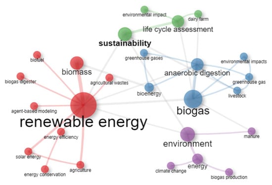 Figure 4 reveals the most commonly used keywords categorized into four clusters; the former contains 30 out of 715 keywords, with the main ones such as: “renewable energy,” “biogas,” “sustainability,” “biomass,” and “environment”, to emphasize the main themes with the highest occurrence. The red cluster is the main one which contains more keywords from the database, with the most important one that is “renewable energy.” Similar to our results, the keyword “renewable energy” was frequently used in the systematic review of Ragazou et al. (2022) [105], which elaborates on the welfare of farmers and its links to energy efficiency and farm sustainability have attracted worldwide scientific interest in recent decades. Their study, which included a bibliometric analysis, investigated how Agriculture 5.0 contributes to farmers; well-being in the post-pandemic era and the gradual transition to an energy-smart economy. According to Rahman et al. (2022) [106], the highest share of on-farm energy is required for irrigation by groundwater pumping. As a result, the use of locally available renewable energy sources (solar, wind, biomass, and geothermal), together with energy-efficient technologies, has become increasingly attractive in the agricultural field for minimizing the impacts of rising energy costs and contributing to climate change protection.