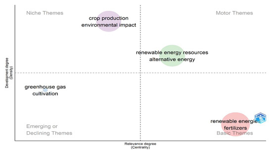 Additionally, the conceptual structure of publications related to renewable energy is provided and helps to understand the topics and define the most important and recent ones. Identifying the conceptual structure could also be helpful in studying the research topic’s evolution over time [91]. The basic idea is that terms (keywords, terms extracted from titles or abstracts) that appear together in a document can be represented as a term co-occurrence network. This analysis allows finding subgroups of strongly linked terms, where each subgroup corresponds to a center of interest or a given research topic of the analyzed collection. Once the analysis is conducted, it is possible to plot the results in a so-called strategic or thematic diagram [92]. The graphical representation allows defining of four typologies of themes [93], depending on the quadrant in which they are plotted. Motor themes: in the upper-right quadrant are characterized by high centrality and high density, meaning they are developed and essential for the research field. Basic Themes in the lower-right quadrant are characterized by high centrality and low density, meaning that these themes are important for a domain and concern general topics transversal to the different research areas of the field. Emerging themes in the lower-left quadrant are characterized by low centrality and low density, which are weakly developed and marginal. Niche themes in the upper-left quadrant are well-developed internal links (high density) but unimportant external links (low centrality), meaning they are of little importance to the field. Specific details of the focus areas are shown in Figure 6.
