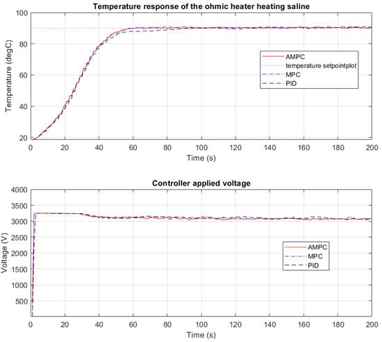 In Figure 4, the plot shows the overlapped temperature output profiles from the CFOH and the voltage profiles when PID, MPC, and AMPC controllers were independently used in heating saline solution.