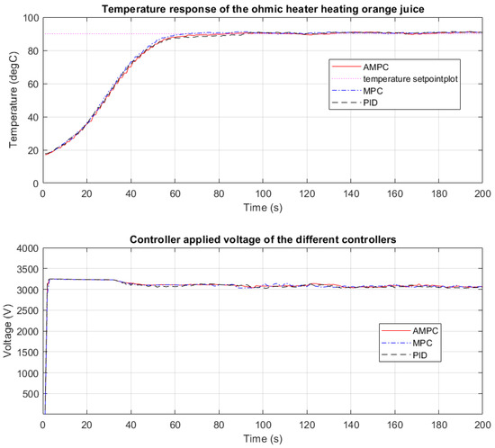 In Figure 6, the rapid heating of the CFOH is seen as the temperature rises from 10 °C to 90 °C and settles in just over 70 s. From Figure 6, voltage oscillation is observed between 30 s and 70 s, this is because the PID controller struggles to keep the output temperature at the desired setpoint of 90 °C. When the MPC control was used, the temperature response of the CFOH was more desirable. The steady-state error is less than 0.8 °C and the output temperature settles within 60 s. The settling time when AMPC was used to heat orange juice to 90 °C is about 65 s. The voltage profile of the AMPC is less aggressive compared with the response of the MPC and reduced voltage oscillation is seen when compared with the PID response.