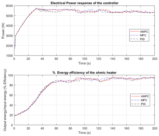 In Figure 7, the electrical power response profiles and energy efficiency of the CFOH when PID, MPC, and AMPC controllers were used to heat orange juice is shown.