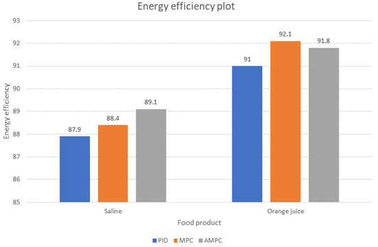 For the heating of orange juice, a low energy efficiency of less than 53% was observed in the first 60 s of operation. This is due to the low input product temperature of 9 °C. After the first 60 s of operation, the temperature built up within the heating chamber significantly increased, hence the increased energy efficiency of 91.0%, 92.2%, and 91.8% for PID, MPC, and AMPC, respectively. Also, no significant difference in the electrical power is observed. In Figure 8, the energy efficiency comparison chart of the controllers when applied to saline and orange juice is shown.