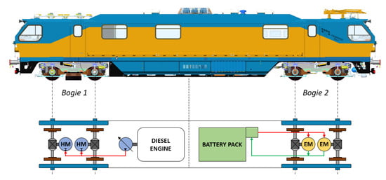 As mentioned in the introduction, the traction system of a train is strictly connected to the line type (i.e., electrified or not). If the route is electrified, traction is purely electric since power is supplied by the continuous overhead line through the pantograph. However, the cost related to the building of the catenary is not justified in low density traffic areas (e.g., secondary and regional lines). This means that non-electrified routes must be travelled by diesel or diesel-electric locomotives, which have worse performance than electric ones in terms of efficiency, lifetime and maintenance costs [21]. As far as the OCPD002-E is concerned, diesel propulsion is necessary since it operates on regional and secondary routes. It should be mentioned that the vehicle is equipped with the pantograph, but its function is to measure relevant data of the catenary without absorbing power from the grid. This means that even though the vehicle is running across an electrified line, the propulsion must be provided by the diesel engine. As for traction, the vehicle is equipped with two bogies, as depicted by Figure 2, which shows the basic architecture of the train.