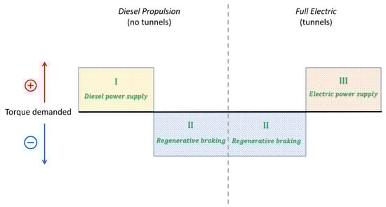 The coupling issue between the diesel and electric traction systems has been examined, and, in particular, how the two power units can alternate and coordinate to manage energy recovery and vehicle traction. As a first step, it is fundamental to define the vehicle operating modes. Due to the reasons discussed about the hybrid configuration, it is supposed that power flows cannot be delivered simultaneously to the wheels. The switch condition from a power unit to another one is the presence of tunnels. As remarked in the introduction, it is reasonable to switch off, or put in idle, the diesel engine nearby tunnels to avoid noise and emissions. For this reason, when the train goes through tunnels the ICE is supposed switched off and mechanically disconnected to the axles, and the traction is carried out by the electric motors powered by the stored energy in the battery. In this way, fuel saving is achieved. On the other hand, the ICE provides traction outside tunnels. According to the path slopes, the electric engines act as motors during traction phases in tunnels, while they work as generators by converting kinetic energy into electrical in downhills. Then, three operative modes can be identified (see Figure 3):
