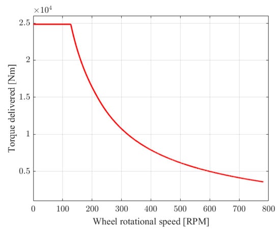 In diesel propulsion operating mode, the ICE provides the total power demand. The maximum power delivered to the wheels depends on the maximum power of the ICE ( = 515 kW). For each ICE operating point, traction system performance can be computed. The limit performance is obtained at the design point, and it is identified by the couple of values (, n) = (515 kW, 1800 RPM). The limit torque curve for diesel propulsion mode has been provided by the company (see Figure 4). As expected, it follows a hyperbolic trend except in the first section where the torque has no gradient and it is limited according to the adhesion principle [30,31].