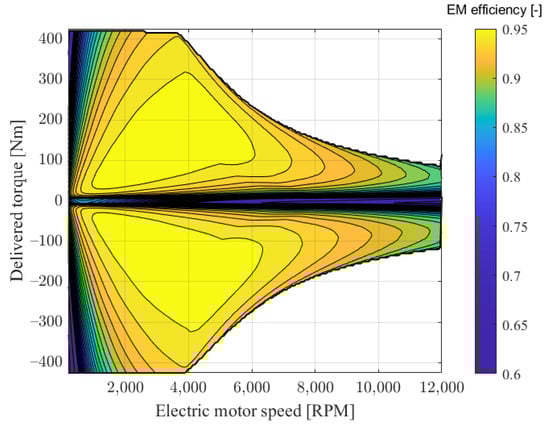 Regarding the electric motor map, values have been derived from the real efficiency map of the electric motors, modeled and shown in Figure 6. Hence, the efficiency of the electric motor, , is determined as function of rotational speed and torque demanded as inputs in Figure 6. Therefore, the value of during full-electric propulsion affects the energy that the electric motors require from the battery, while during regenerative braking, it represents the fraction of recovered energy that can be supplied to the storage.