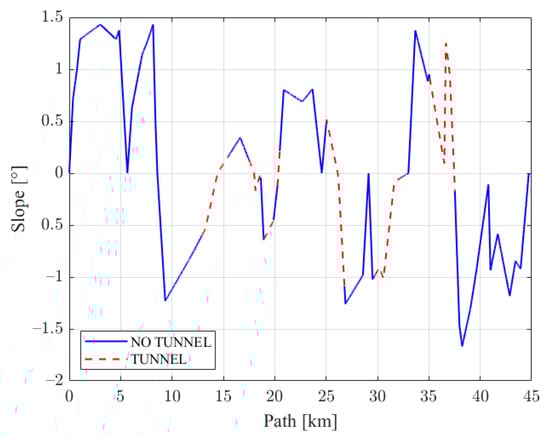 Slope, , of the route as a function of the space travelled. Blue lines show no-tunnel sections, red dotted lines indicate tunnel sections.