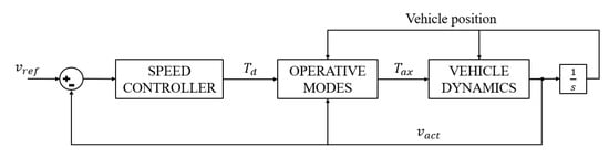 The simplified structure of the model, which controls the demanded torque , is shown in Figure 8. Therefore, the control system is performed by evaluating the error of the actual speed of the train, , with respect to the reference speed, , set equal to 50 km/h.