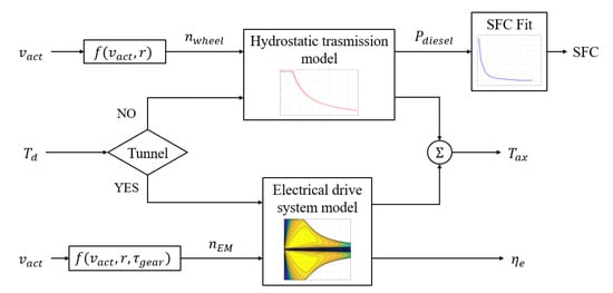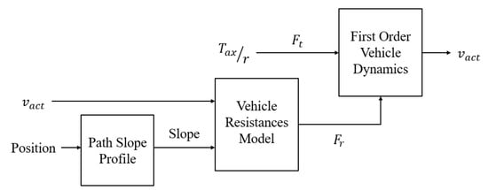 Figure 10 represents the vehicle dynamics block, where the tractive force, , and the resisting force, , are obtained from equations of the longitudinal dynamics of the vehicle.