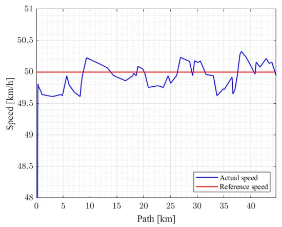 Based on the model and the regenerative braking strategy proposed in the previous Section 2.2, simulations results regarding the analysed railway profile are presented. Figure 11 confirms that the control is satisfactory because it follows the reference speed fairly accurately. Indeed, the actual speed varies in a short range between 49.61 km/h and 50.32 km/h.