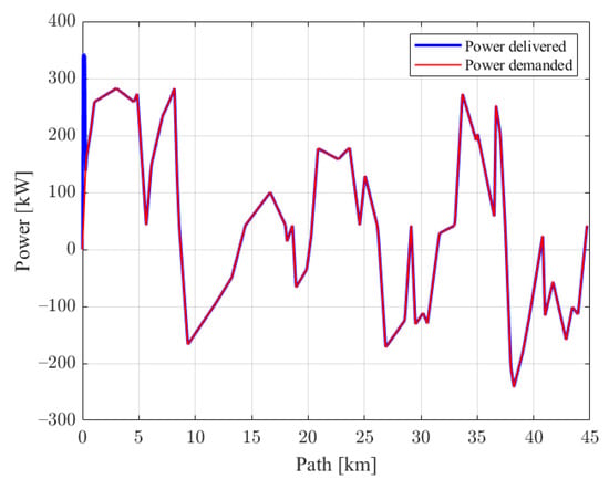 Control quality is confirmed also by the comparison between the overall demand profile and the effective power delivered to the wheels (Figure 12); the initial difference is due to the vehicle inertia. These power flows are referred to the entire vehicle, without making a distinction between which drive train is providing power. It is clear how, due to vehicle dynamics, power flows follow the path gradient profile shown in Figure 7.