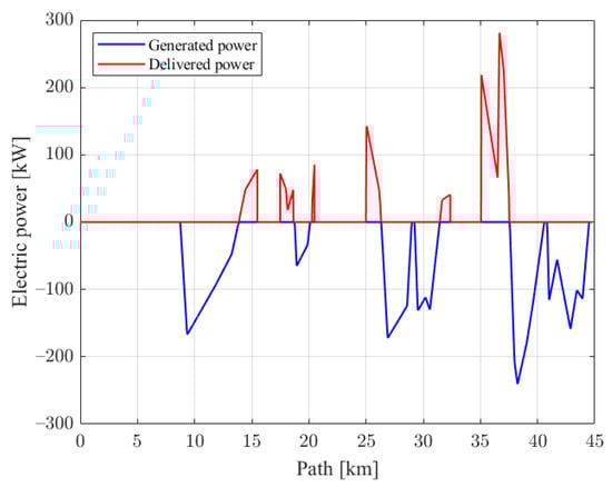 Figure 13 reports the trend of the electric power flow delivered to the axles as a function of the distance travelled by the vehicle. Red lines indicate positive power flow delivered in full-electric operative mode, whereas blue lines (negative values) represent the power recovered during regenerative braking phases.