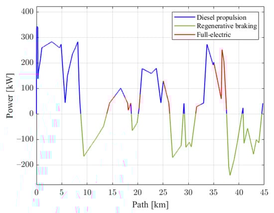 When diesel propulsion operative mode is active, the vehicle is outside tunnels and the electric motors operate as generators. The difference between the three operative modes, according to the energy management strategy proposed, is clearly depicted in Figure 14, where the total power delivered by the overall traction system along the route is plotted. The change of line colors indicates the points where the switch condition from an operative mode to another one occurs. By the analysis of this result, it is clear how the electric drive system works for the most part in regenerative braking since full-electric propulsion is limited only to tunnel sections. By the integration of the power delivered along the route, it is possible to estimate the energy flows associated to each operative mode.