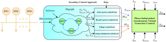 The authors in [41] proposed distributed primary and secondary control schemes for single and three phase microgrids (S/T-MGs). For this study, unbalanced distributed generators and loads non-idealities were considered. As in [34], the communication network was modeled as a digraph and the microgrid was considered as a multi-agent system, where each DG is a follower-agent. Moreover, the distributed secondary control was based on a consensus problem. However, in this work, energy storage systems (ESS), renewable energy sources (RES), and communication delays constraints were taken into consideration. For the primary controller, a variation of the virtual synchronous generator control approach was implemented to have independent and flexible control of the active/reactive power and the voltage magnitude of each phase. This flexibility facilitates the design and implementation of the secondary control system in MGs with single-phase and three-phase generators. The proposed phase-independent virtual synchronous generator (P-VSG) control for the primary controller is giving by: