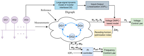 where are the frequency droop control coefficients of the DG, is the cut-off frequency of the low-pass filter and and are the output and filtered reactive power of each DG. Figure 11 shows a graphical summary of the proposed approach.