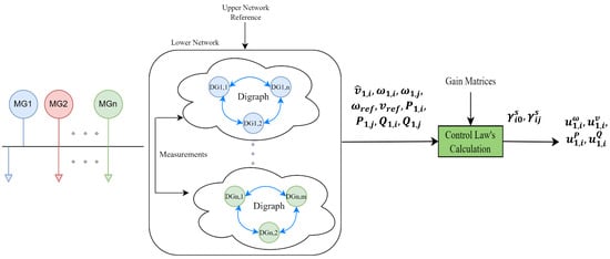 The calculated nominal values are sent to the primary control to regulate the frequency and voltage deviations. It is important to mention that the two-layer communication network was designed considering different time scales . Furthermore, to meet the time-scale separation criteria in the hierarchical information flow of the microgrids clusters, the dynamics of each layer were taken into account. In addition, using the Gershgorin circle theorem, the gain matrices (,,) and terminal times (,), can be calculated. Therefore, the distributed controllers have discrete inputs (e.g., neighbors’ information and local measurements) that are updated every iteration, reducing the DG’s communication bandwidth requirements (e.g., an intermittent low-bandwidth communication network with its neighbors). Figure 6 shows a graphical summary of the proposed approach.