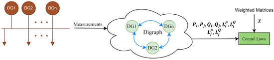 where is a column vector, ‘∘’ and ‘’ represents the Hadamard product and Hadamard inverse function, respectively. The vector X is the parameter that can be replaced in the weighted matrices to change the outputs of the DGs through the control laws. Allowing the system to reach different targets iteratively. It is important to notice that by replacing all the “P” and “p” terms for “Q” and “q” terms, respectively, the reactive power control law can be calculated. Figure 7 shows a graphical summary of the proposed approach.