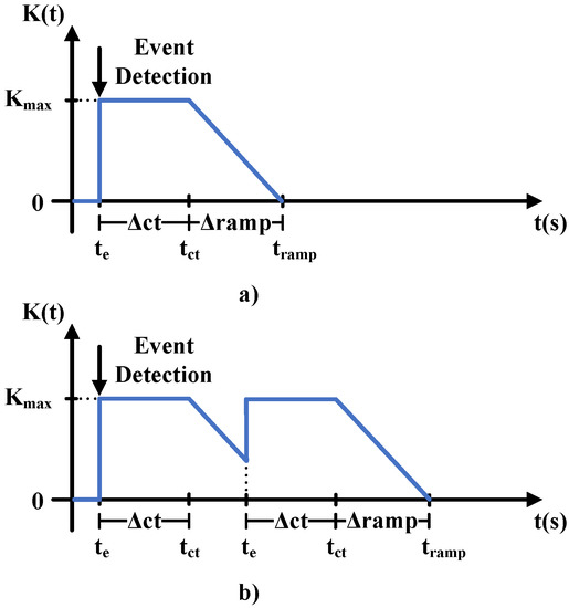 In the proposed time-dependent protocol, varies temporarily depending in the occurrence of an event. In other words, when an event is detected, the value of varies instantaneously from zero to where it remains constant for a time frame . After this time frame, the value of linearly returns to zero. If another event is detected before the protocol procedure is completed, the time count and the initial conditions are reset, bringing back to , as depicted in Figure 8. Therefore, a good event detection system is critical to ensuring the performance of the suggested approach. Hence, two event-detection thresholds were used: one based on the proportion of active power change on the system and the other one in frequency changes. When at least one of the thresholds is exceeded, an event is identified.