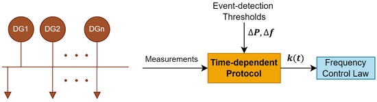 The proposal of this secondary control system without a communication network for islanded microgrids is to offer a simple approach based on a switched control scheme and a time-dependent protocol. In addition to its simple design and implementation, this approach also has some other outstanding features. For instance, it offers improved flexibility and reliability, since no communications are required to operate the secondary control. Figure 9 shows a graphical summary of the proposed approach.