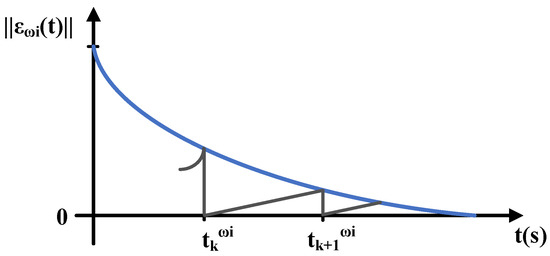 Equation (38) can ensure the global stability of the system frequency if at least one DG can always receive information from agent0 and the event-triggered time mechanism is defined as function of the neighborhood tracking error () and the estimation error () as follows: