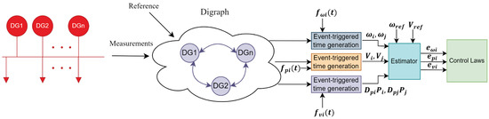 It can be seen that the frequency control law is composed of two sections. The first one expresses that all DGs operate as a group to follow the reference value through a sparse communication network, and the second one in charge of maintaining an accurate power sharing in a finite time. Figure 5 shows a graphical summary of the proposed approach.