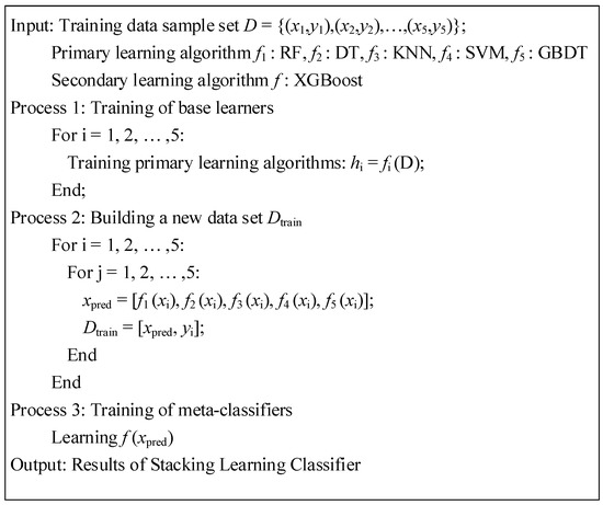 The model stacking algorithm in ensemble learning is a hierarchical multi-model fusion algorithm. The pseudo-code of the Stacking model fusion is shown in Figure 1.