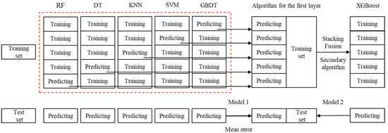 As shown in Figure 2, the top half represents the process of 5-fold cross-validation with different base learners, outputting the predicted values. In the 5-fold cross-validation process of the RF model, the model training process is as follows: Firstly, the 11,567 sample data of each training set X_train is divided into five parts. In each cross-validation process, 2313 × 4 data are taken for multi-classification training. After training, the remaining 2315 data are verified, the predicted value is recorded as rf_pred1, and the size of rf_pred1 is (2315, 1). The trained RF model is used to predict the test set Y_test from the original data, and the random forest classifier prediction result on the test set Y_test, denoted as rf_test1, can be obtained. The model correctness of the random forest-based learner for the first cross-validation, denoted as rf_acc1, is obtained by comparing the true label Y_test1 in the predicted dataset of rf_test1 and the original dataset. The above process was repeated four times, and the remaining 4 data were cross-validated separately. In the training process of each base learner, the training set prediction data rf_pred1, rf_pred2, rf_pred3, rf_pred4, and rf_pred5 under each cross-validation, and the test set prediction data rf_test1, rf_test2, rf_test3, rf_test4, and rf_test5 under each cross-validation can be obtained. The training set prediction data RF_pred with a size of (2315, 5) can be obtained by combining the training set prediction data by columns. For the test set prediction data rf_test1, rf_test2, rf_test3, rf_test4, and rf_test5, the test set prediction data RF_test with a size of (5698, 1) can be obtained by averaging the parts of the test set prediction data. The random forest model accuracy rate RF_acc can be obtained by averaging the accuracy of each output of the random forest model with five cross-validations. At this point, the first base learner training is completed.