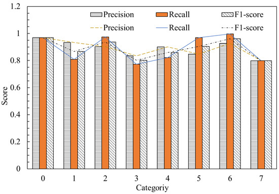 The precision rate, recall rate, and F1 value of the Stacking model fusion method are calculated by the confusion matrix, and the recognition results of each working condition based on the Stacking model fusion method are summarized. Table 6 shows the statistics of drilling multi-condition classification recognition results based on the Stacking model fusion method. Figure 3 shows a schematic diagram evaluating the drilling working condition recognition effect.