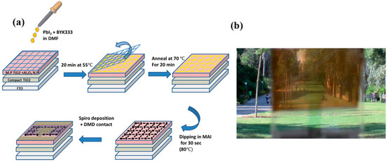 (a) A two-step deposition process used to create a semitransparent perovskite solar cell. The PbI2 grid is first created and annealed, after which the entire electrode is submerged in the MAI solution to create the MAPbI3 grid. The hole transport material (HTM) layer is covered with an evaporated dielectric-metal-dielectric contact during the final stage. (b) Semitransparent device. [83].