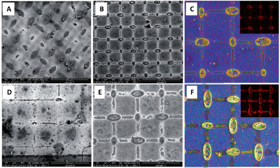 HRSEM images for 0.2 M PbI2 grid obtained using: (A) 85 µm size of mesh before annealing. (B) With annealing, mesh size. (C) PbI2 chemical mapping (A grid developed during annealing using a mesh size of 85 µm is coloured yellow for the Pb metal and red for the inset I). (D) 240 µm without annealing mesh. (E) 240 µm mesh size with annealing (F) PbI2 chemical mapping (A grid developed during annealing using a mesh size of 240 µm is coloured yellow for the Pb metal and red for inset I). When the grid was formed, the temperature was 70 °C for samples B, C, E and F. [83].